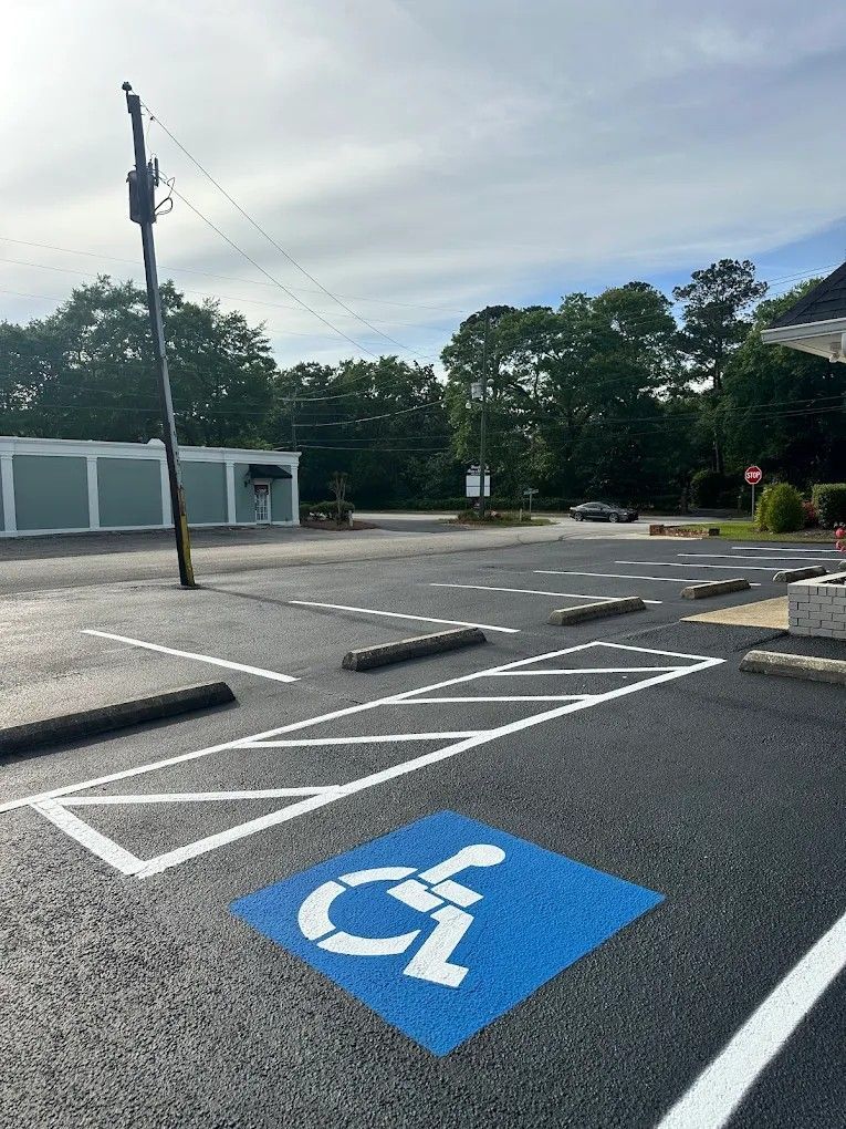 Line striping that supports organized traffic flow in parking areas across Florence, Sumter, Columbia, Camden, and Charlotte